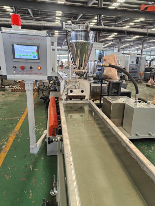 捏合螺塊以及反旋螺塊;螺桿組件串聯(lián)式排列組合;2)芯軸:采用高韌性、高抗彎、高強(qiáng)度的優(yōu)質(zhì)合金鋼40CrNiMoA,調(diào)質(zhì)硬度HB300-350;螺紋元件與芯軸為漸開線聯(lián)接;強(qiáng)度高,承載負(fù)荷大,拆裝組合方便; 3)螺紋元件材質(zhì)為優(yōu)質(zhì)高速工具鋼6542,高溫真空淬火熱處理;整體硬度:HRC60-64;螺桿元件通過加工中心制作,由曲面成型磨加工;5、料筒1)材質(zhì):45#鋼為基體,∞內(nèi)孔采用優(yōu)質(zhì)雙合金襯套;共十二節(jié),L=290mm/節(jié),第一節(jié)筒體為進(jìn)料筒體,第六為自然排氣;第十節(jié)筒體為抽真空;其余筒體為閉口筒體,筒體采用軟水冷卻;2)加熱區(qū)段:進(jìn)料區(qū)不加熱,其他采用優(yōu)質(zhì)鑄鋁加熱器。雙螺桿造粒機(jī)6、水冷卻系統(tǒng)1)水泵泵電機(jī)功率:3kw;自動(dòng)控水電磁閥;手動(dòng)閥用銅閘閥控制;加大水流量,2)采用環(huán)保風(fēng)冷卻系統(tǒng)(環(huán)保型:發(fā)明專利號(hào):CN201911312134.6)不需要接外循環(huán)水冷卻,不用徘外水;采用閉環(huán)循環(huán)系統(tǒng) 7.水循環(huán)真空泵,1)水循環(huán)真空泵電機(jī)功率:2.2KW,真空泵采用環(huán)保冷卻系統(tǒng)(環(huán)保型:發(fā)明專利號(hào):CN201911312115.3)不需要接外循環(huán)水冷卻,采用閉環(huán)循環(huán)系統(tǒng),8、液壓板式換網(wǎng):1)換網(wǎng)器,板式過濾自動(dòng)換網(wǎng)器,流量截面為圓形;2)液壓缸、液壓站等一套,采用YA-N46抗磨46#液壓油;(油品需客戶自行采購)9、機(jī)頭裝置:1) 熱電偶與壓力傳感器分開安裝,分別用于檢測(cè)溫度和壓力